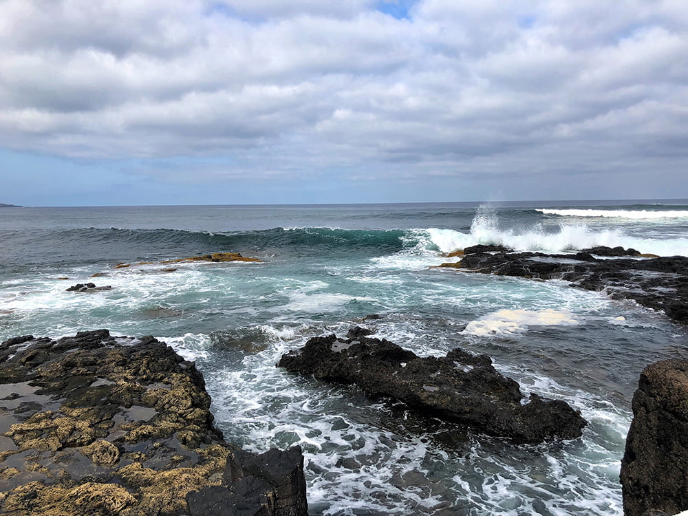 Das Landschaftsbild ist an der wilden Küste von Punta del Hidalgo sehr beeindruckend. Die großen Wellen rollen auf die Kanareninsel zu, die Gezeitenzone bremst sie aus, die Wellen verwandeln sich in riesige Mengen an Weißwasser und rauschen laut und mächtig auf der Felsplattform aus. In der Ferne kannst du auf der einen Seite die Nordwestküste von Teneriffa sehen, auf der anderen Seite das Anaga-Gebirge.