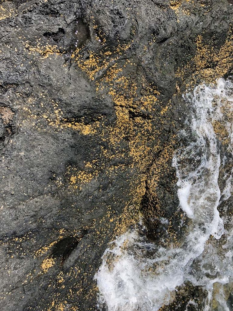 Bei Flut ist die Gezeitenzone kaum sichtbar, nur vereinzelte felsen ragen aus dem Wasser. Zieht sich das Wasser bei Ebbe zurück, kommt die Felsplattform zum Vorschein und du erkennst das Lavagestein.