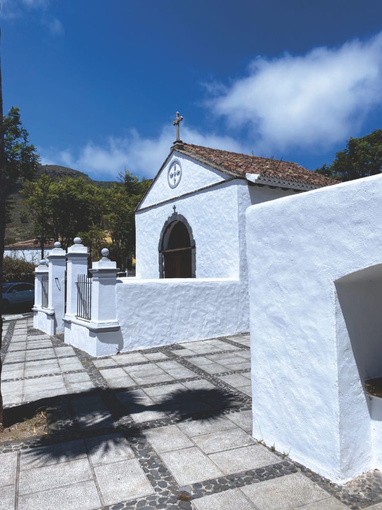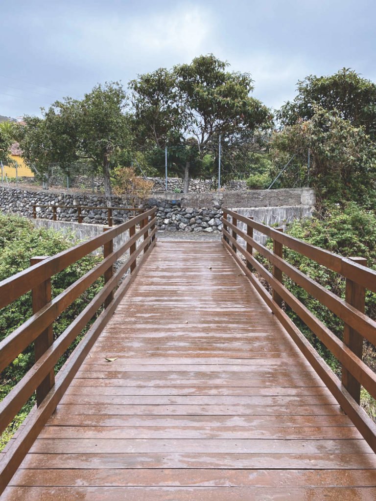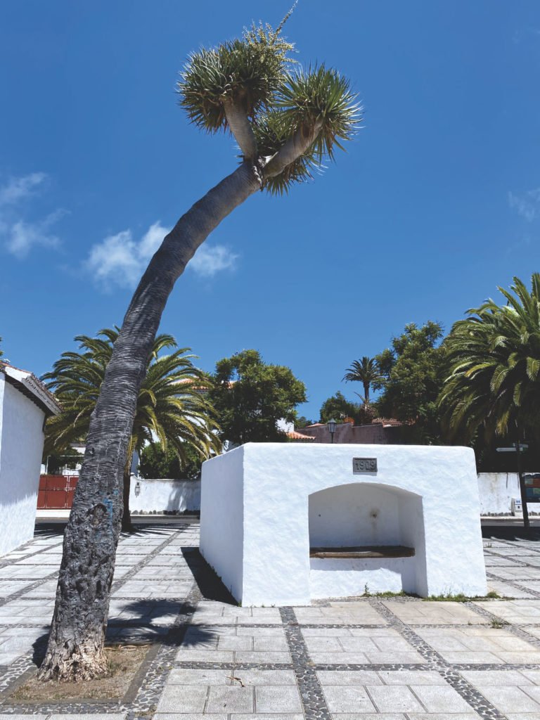 Zudem war es Tradition vor noblen Wohnhäusern eine Palme und einen Drago nebeneinander zu pflanzen. Dies kannst du ein paar Schritte weiter hinter der asphaltierten Brücke entdecken. Wenn du von dort zurückblickst, siehst du nebeneinanderstehend eine hochgewachsene Palme und einen sehr alten Drago (Drachenbaum). Dahinter steht das kleine Häuschen des damaligen Priesters.