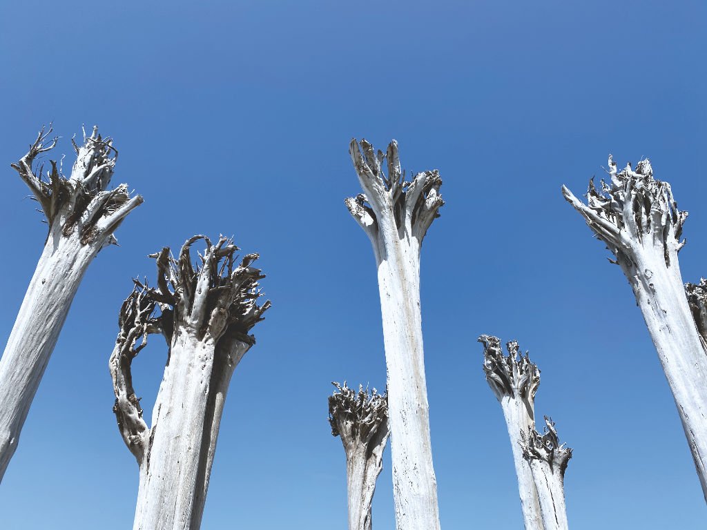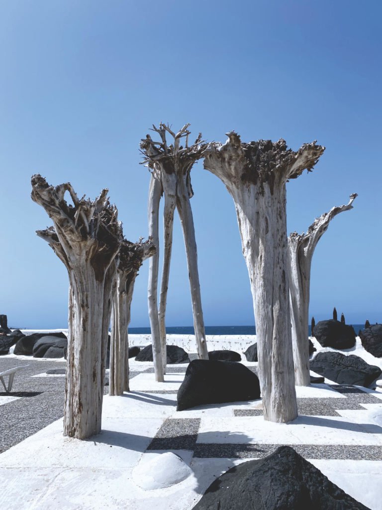 Dort steht auch das Kunstobjekt Raíces al Viento (Wurzeln im Wind). Dies sind Eukalyptusbäume, die kopfüber ihre Wurzeln in das Element Luft, oder besser gesagt in die ganzjährigen Winde halten.