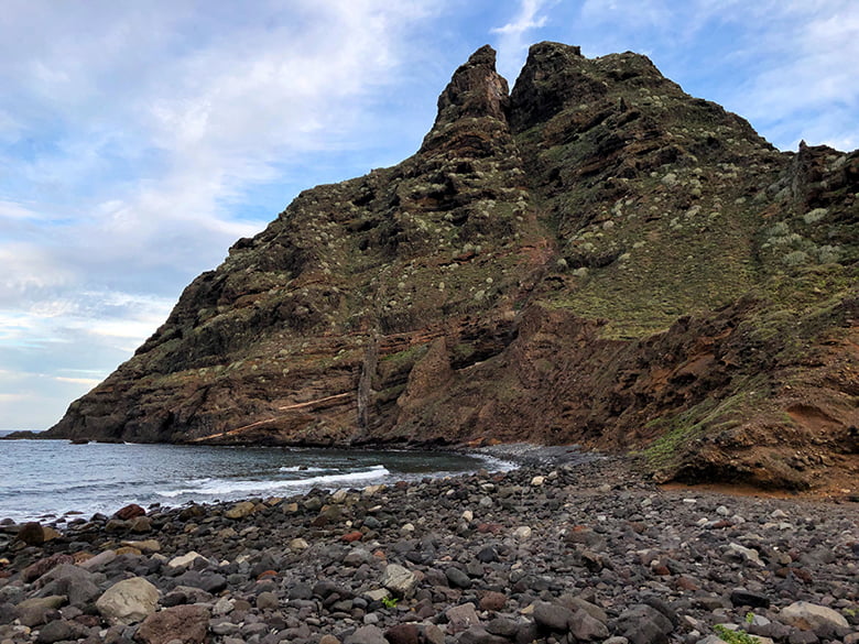 Variante: Du kannst hier einen Abstecher zum Strand Playa de los Troches machen. Dazu nimmst du am Mirador Punta del Hidalgo den kleinen asphaltierten Weg Richtung Küste. Diesen folgst du bis zum Ende. Du kommst an ein verlassenes Haus und kreuzt den Wanderweg in die Berge. Halte dich hier unten und folge den Trampelpfad Richtung Meer. Am Playa de los Roches befindest du dich direkt am Fuße der „Dos Hermanos“